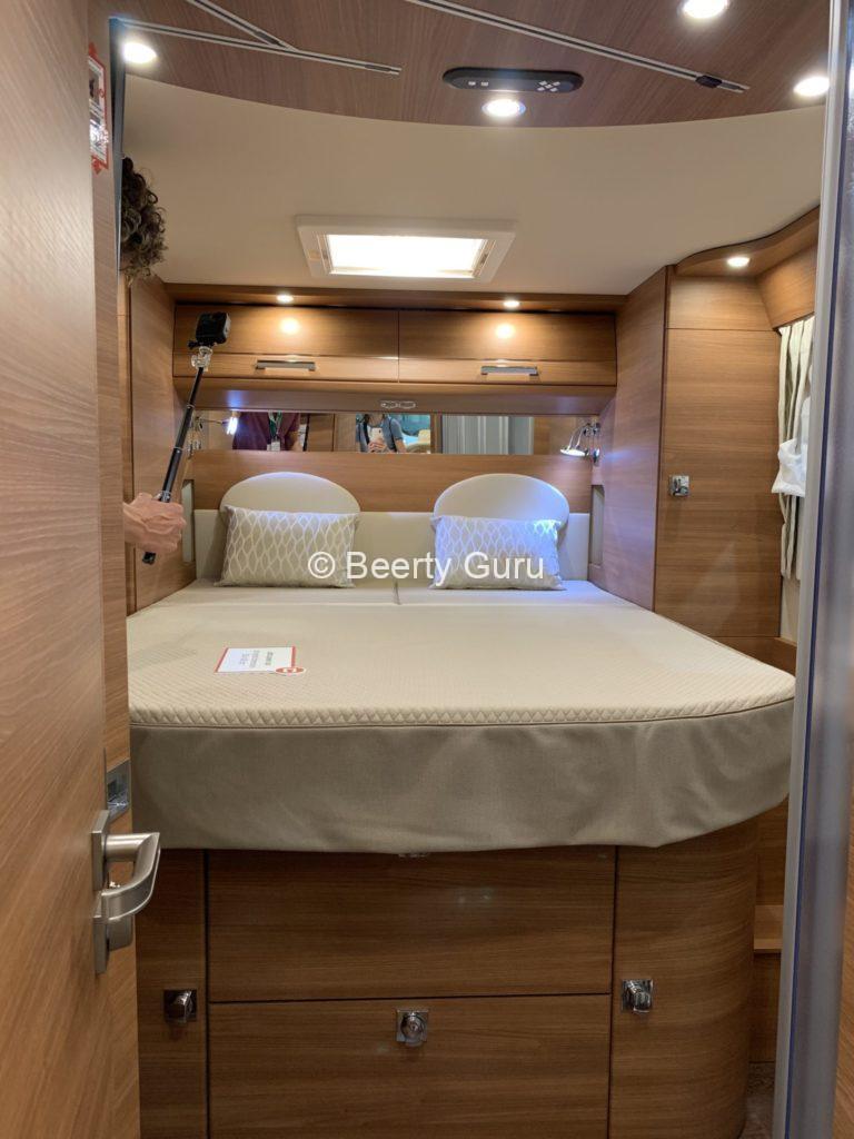 Väčšina dnešných modelov má veľkú mladomanželskú posteľ v zadnej časti a potom druhú veľkú posteľ v prednej časti. Tá predná posteľ sa v integrovaných a polointegrovaných karavanoch nejakým spôsobom buď rozkladá alebo zosúva z vrchu. Pri alkovniach je posteľ stále dostupná v alkovni nad kabínou vodiča.