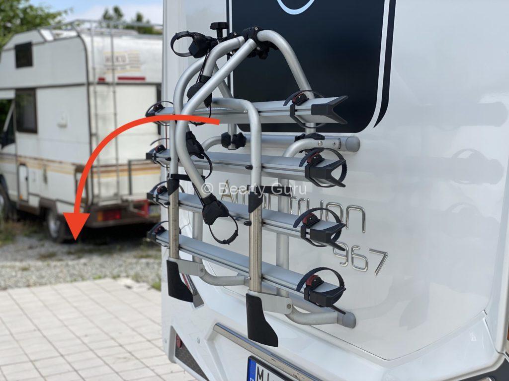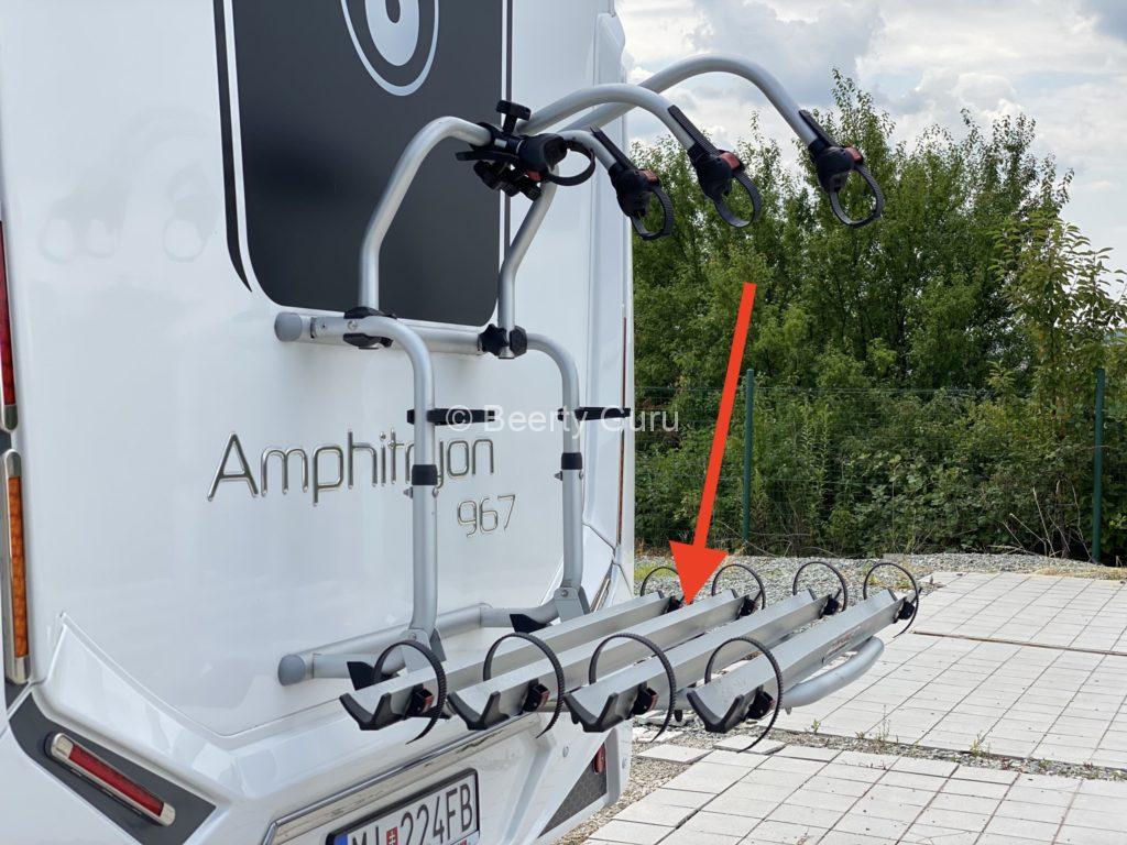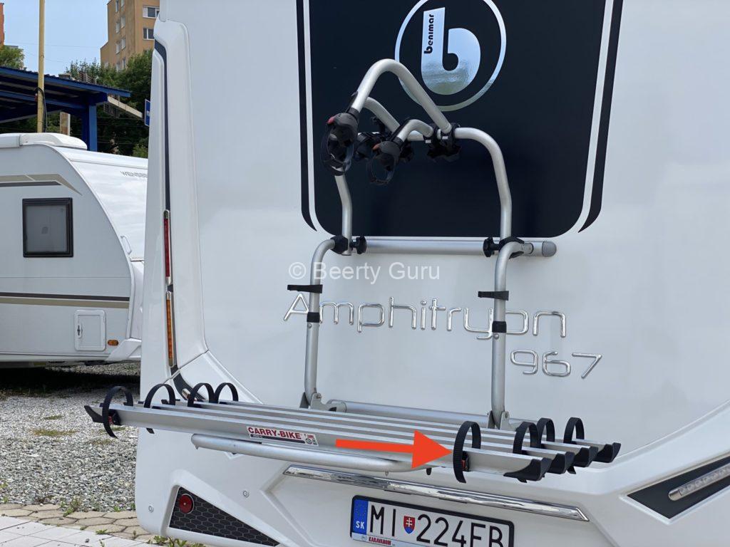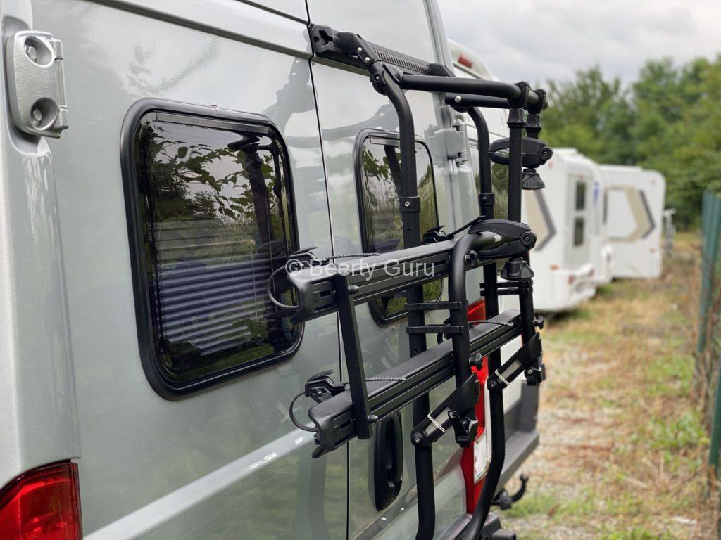 A kerékpártartó a lakókocsi hátsó falán található. Az állvány nem tartalmaz zárat, ezért a kerékpárokat kerékpárzárral kell lezárni.